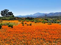 We hebben veel verschillende locaties bezocht en vastgelegd; dit is een foto in het reservaat Skilpad in Namaqualand. Een prachtig veld met oranje 'Spaanse Margrieten' onder een strak blauwe lucht. In Zuid-Afrika noemen ze deze bloemen Namaqualand daisies. Er loopt een smal pad voor de bezoekers. Rechts en links zijn watermolens zichtbaar die bij wind, water oppompen. Bedenk dat dit niet is aangelegd maar dat dit puur natuur is. Dit is midden in de woestijn en in het voorjaar na de eerste regens verandert zo'n woestijn in een zee van bloemen. Dit is zo'n prachtig fenomeen, dat is met woorden moeilijk te beschrijven.