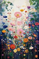 Een weelderige bloemenzee waarin klaprozen in verschillende tinten roze, rood, oranje en blauw de hoofdrol spelen. De bloemen rijzen als elegante dansers op tegen een dromerige achtergrond met subtiele kleurschakeringen. De losse, impressionistische schilderstijl, gëinspireerd door Gustav Klimt, creëert een gevoel van beweging en lichtheid, terwijl de verticale compositie zorgt voor een gevoel van groei en levenskracht.