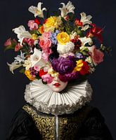 Deze betoverende afbeelding van een figuur met een weelderige bloemenhoed en een elegante kraag toont een surrealistische samensmelting van schoonheid en kunst, waarbij natuur en mode op een unieke manier samenkomen.