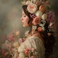 Een dromerig, romantisch portret van een vrouw in profiel, haar donkere haar en schouders bedekt met een cascade van weelderige, soft-focus roze en perzik rozen.