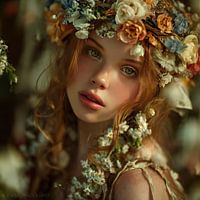 Een betoverend portret van een vrouw met kastanjebruin haar, die een uitgebreide kroon van aardetinten bloemen en gipskruid draagt, intens starend vanuit een zachte, etherische tuin.