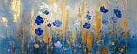Bloemkunst | Blue Petals and Golden Light - Dit bloemen schilderij toont een levendig tafereel van bloeiende blauwe en lichtpaarse bloemen tegen een achtergrond met abstracte gouden en blauwe verticale strepen.