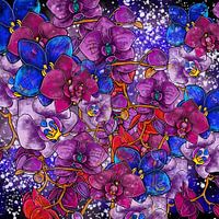 Kleurrijke orchideeën op zwarte achtergrond - Dit schilderij toont de orchideeën (Orchideeën) in al hun kleuren: rood, blauw, paars, roze en bordeauxrood. Orchideeën zijn een van de meest populaire bloemen - ze bloeien lang en zijn gewoonweg prachtig. De kleurrijke bloemen van deze bloem zijn uniek.