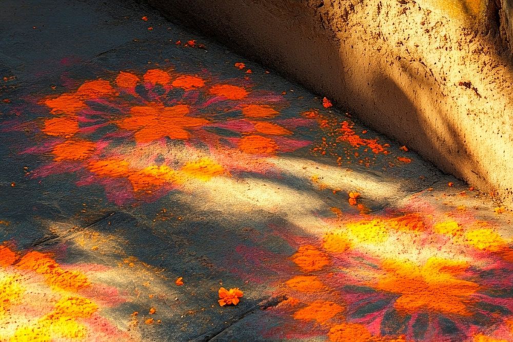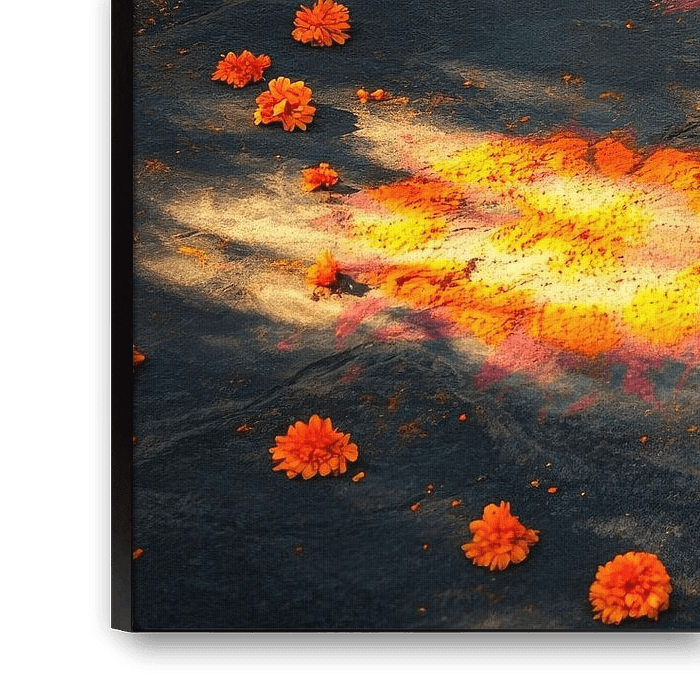 Er ontvouwt zich een betoverend kleurenspel in heldere oranje tinten, terwijl de tere bloemblaadjes een uitnodigend spoor achterlaten. Deze harmonieuze compositie roept associaties op met levendige festivals en de geur van de natuur, ideaal voor het verfraaien van een woonkamer of hal, waar het een vriendelijke en levendige sfeer creëert.