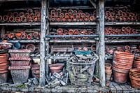 Opslag voor de bloempotten die gebruikt worden in een tuinderij.