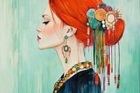 Bloemrijk Portret - Dit vrouwenportret schilderij toont een jonge vrouw van de zijkant met een kleurrijke, bloemrijke haardecoratie in levendige tinten op een lichtgroene achtergrond, waarbij details als kettingen en een oorbel extra karakter geven aan haar serene uitstraling.