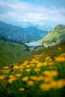 Bloemrijk uitzicht op de Seealpsee in de Allgäuer Alpen