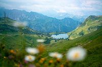 Bloemrijk uitzicht op de Seealpsee in de Allgäuer Alpen