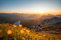 Bloemrijk uitzicht op de bergen van Tannheim bij zonsondergang