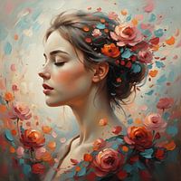 Floral Reverie - Abstract Impressionistisch Portret brengt een vleugje hoge kunst door vrouwelijke elegantie te mengen met een explosie van botanische kleuren. Dit zijaanzicht portret van een vrouw gaat naadloos over in abstracte penseelstreken die lijken op bloeiende bloemen, waardoor een visuele harmonie ontstaat die zowel rustgevend als fascinerend is. Het warme kleurenpalet - rood, oranje, roze en groenblauw - zorgt voor een gevoel van levendigheid en energie, terwijl de zachte verlichting en klassieke olieverfachtige texturen het werk een museumkwaliteit uitstraling geven.