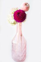 Deze mooie paarse ronde bloem, de Dahlia, in een stilleven vorm gegeven. Met roze glaswerk en de ronde vorm van de appel en de gedroogde bloemen.