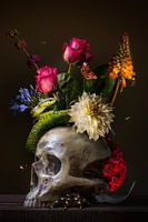 Royal Skull is een intrigerend stilleven dat speelt met contrasten: leven en dood, pracht en verval, stilte en beweging. Uit een verweerde schedel ontspringt een explosie van levendige bloemen, als een symbool van wedergeboorte en de onstuitbare kracht van de natuur.