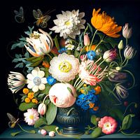 Een prachtig stilleven met een weelderige bloemencompositie in een sierlijk versierde vaas ontvouwt zich tegen een donkere achtergrond. De felle kleuren van tulpen, pioenen, margrieten en korenbloemen contrasteren met het diepe zwart, waardoor de delicate details van de bloemblaadjes en bladeren nog meer opvallen. Vlinders en een bij voegen delicate accenten toe, terwijl verspreide bloemen en bladeren willekeurig op tafel lijken te liggen en een natuurlijke informaliteit aan het harmonieuze arrangement geven. De voorstelling doet denken aan de grote meesters van de barokke stillevenschilderkunst, vastgelegd met adembenemende aandacht voor detail en een vleugje vergankelijkheid.