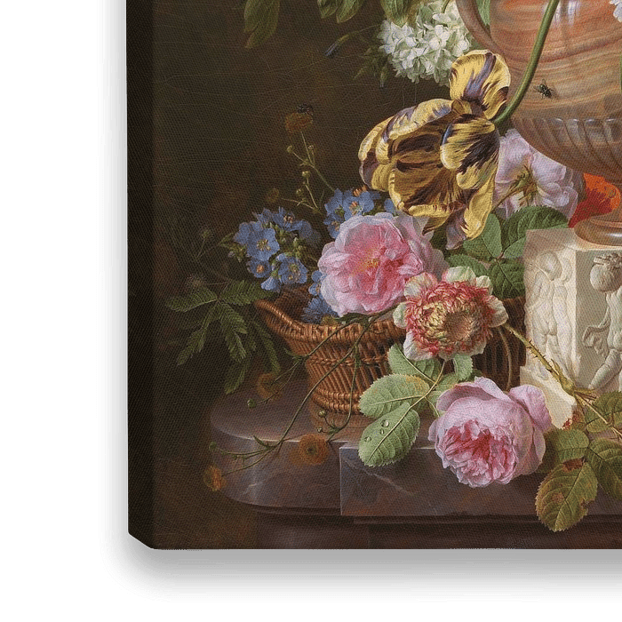 Een prachtig stilleven van bloemen door Gerard van Spaendonck en oprecht het mooiste bloemenschilderij dat ik ooit heb gezien! De kleuren, penseelstreken en details zijn ongeëvenaard vergeleken met andere schilderijen van tijdgenoten. Te zien zijn de kleurrijke tulpen en pioenrozen, maar ook kun je kleine insecten en een hommel vinden in dit werk. Ik heb de afbeelding digitaal gerestaureerd en teruggebracht naar de oorspronkelijke kleuren van vroeger.