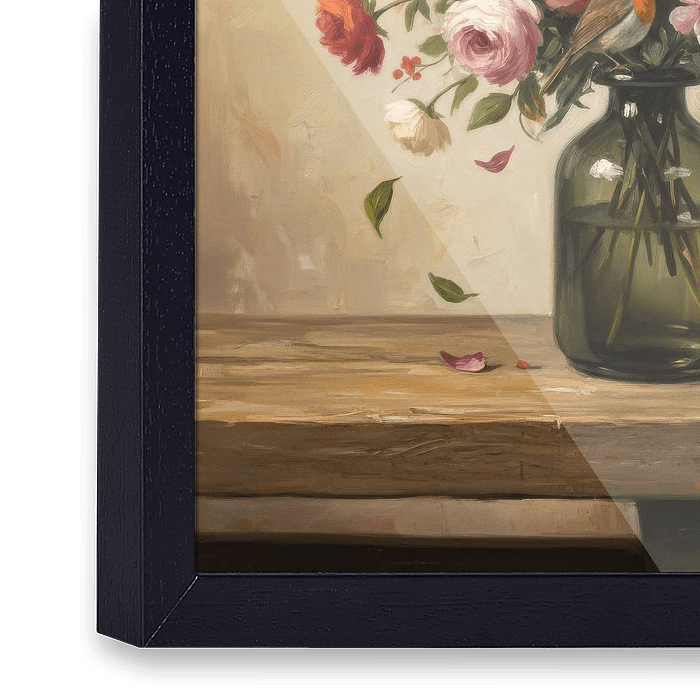 Stijlvol en warm bloemstilleven in olieverfstijl, met een vol boeket in rijke rood-, roze- en crèmetinten. De bloemen staan in een klassieke groene glazen vaas, wat het geheel een rustige en warme uitstraling geeft. Een roodborstje zit subtiel tussen de bloemen, terwijl vlinders en dwarrelende blaadjes het schilderij een levendige en…