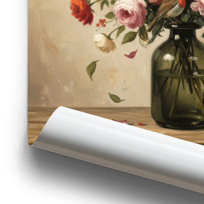 Stijlvol en warm bloemstilleven in olieverfstijl, met een vol boeket in rijke rood-, roze- en crèmetinten. De bloemen staan in een klassieke groene glazen vaas, wat het geheel een rustige en warme uitstraling geeft. Een roodborstje zit subtiel tussen de bloemen, terwijl vlinders en dwarrelende blaadjes het schilderij een levendige en…
