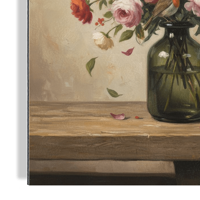 Stijlvol en warm bloemstilleven in olieverfstijl, met een vol boeket in rijke rood-, roze- en crèmetinten. De bloemen staan in een klassieke groene glazen vaas, wat het geheel een rustige en warme uitstraling geeft. Een roodborstje zit subtiel tussen de bloemen, terwijl vlinders en dwarrelende blaadjes het schilderij een levendige en…
