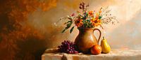 Een harmonieus samenspel van levendige kleuren en vormen: Een stijlvolle kruik vol bloemen gecombineerd met sappig fruit creëert een uitnodigende sfeer. De zachte oranje tinten doen denken aan zonsopgangen en brengen warmte in elke kamer. Dit kunstwerk is ideaal voor in de keuken of eetkamer en zorgt voor een vrolijke stemming en een stimulerend gesprek.