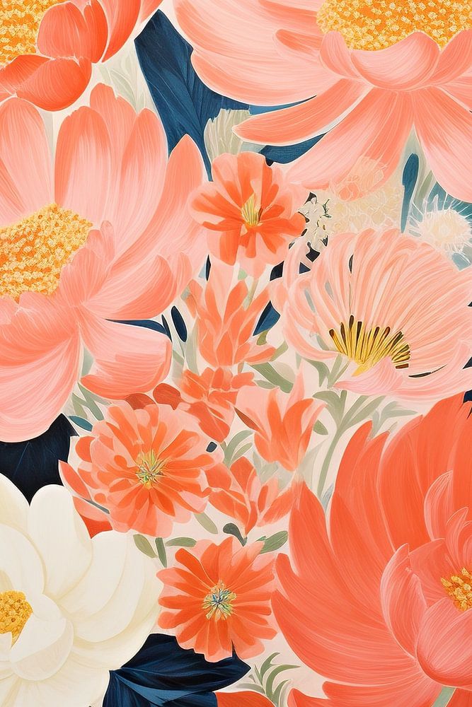 Bloemtuin Kunst - Het schilderij toont een levendige tuin vol grote bloemen, uitgevoerd in een warm en uitnodigend kleurenpalet met overheersende Peach Fuzz-tinten. Het geheel oogt zorgvuldig en gedetailleerd met een vleugje speelsheid in de bloemenvormen en de subtiele aanwezigheid van fauna.