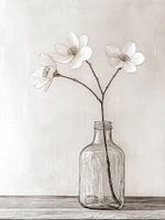 Bloesem | Effortless Elegance - Dit bloemen schilderij toont serene witte bloesems aan een slanke tak, sierlijk geplaatst in een glazen vaas tegen een zachtgetinte achtergrond, die een gevoel van rust en eenvoud uitstraalt.