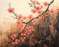 Bloesem Goud | Blossom Veins - Dit bloemen schilderij toont een elegante tak met levendige roze bloesems die uitbarsten tegen een zacht verzadigde goud-bruine achtergrond met subtiele verticale textuurstrepen.