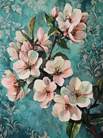 Bloesem | Roze Witte Bloemen - Dit bloemen schilderij toont een groepje heldere roze-witte bloesems met donkergroene bladeren, uitgelicht tegen een sierlijk versierde turquoise achtergrond.