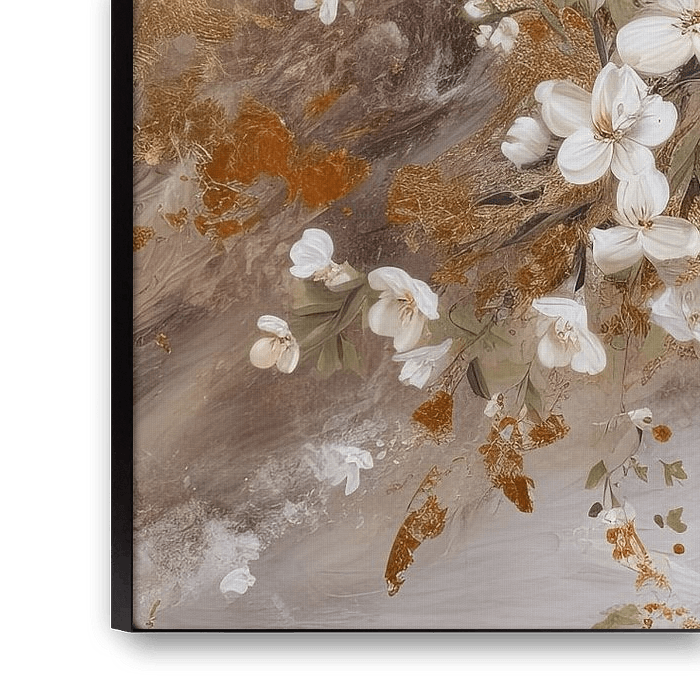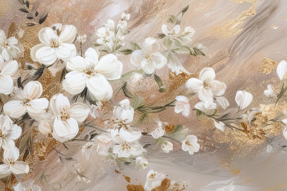 De afbeelding "Bloesem en goud" combineert de delicate schoonheid van bloesem met luxueuze gouden accenten, wat een harmonieus en verfijnd geheel creëert. De zachte bloesemkleuren in contrast met het goud geven het kunstwerk een elegante en moderne uitstraling. Dit werk is perfect voor wie houdt van natuurkunst met een vleugje glamour, en het voegt een warme, stijlvolle sfeer toe aan je interieur. Een prachtige keuze voor een verfijnde en serene omgeving.