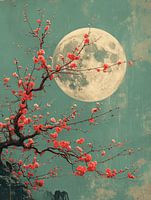Landschap met bloesem in Japan. Een sereen landschap in zachte pastelkleuren van een Japans landschap, bloesem en volle maan. Kies zelf het formaat en materiaal bij dit werk.