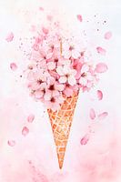 Een delicate droom van pastelkleuren bloeit op in een wafel gevuld met bloeiende kersenbloesems. De zachte bloemblaadjes zweven liefdevol rond, terwijl de achtergrond glinstert in een delicate roze kleur. Deze fantasierijke combinatie van ijs en bloemen verrukt het hart en straalt een vleugje lentemagie uit.