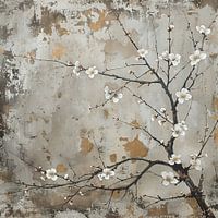 Dit kunstwerk van bloesems is gemaakt in de stijl van de Chinese kunst, met witte bloemen en bruine takken op een antieke achtergrond, met lichte grijstinten en een getextureerd oppervlak. Het bevat prachtige details, traditionele elementen van inktwas schilderkunst, zachte lichteffecten, een statische compositie, delicate penseelstreken en warme kleuren.