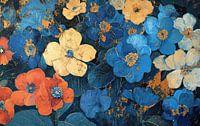Bloesem in Goud - Dit is een levendig bloemenschilderij waarin blauwe en oranje tinten subtiel contrasteren met de donkere achtergrond, wat een mysterieus maar warm effect creëert. De stijl is losjes en expressief; je kunt de penseelstreken bijna voelen. De verspreide goudkleurige details geven het werk een verfijnde finishing…