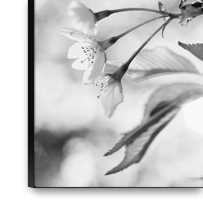 Foto van bloesem en bladeren aan een bloesemboom. Foto is gemaakt in de lente. Door de grote diafragma-opening is er veel onscherpte in de achtergrond. Ook verkrijgbaar in kleur.