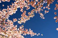 De roze prunus is in de nacht net zo prachtig en steekt prachtig af tegen de intens blauwe lucht, vlak na zonsondergang