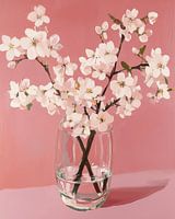 De roze achtergrond versterkt de tederheid van de bloesems en geeft het werk een warme, lichte sfeer. Het geheel doet denken aan het begin van de lente, aan nieuwe energie en momenten van stilte.