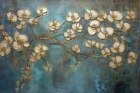 "Bloesem op Blauw" toont een tak vol delicate witte bloemen tegen een achtergrond van verschillende tinten blauw. De bloemen hebben een subtiele gouden glans, wat een mooi contrast vormt met de koele blauwe tinten op de achtergrond. Het kleurenpalet bestaat voornamelijk uit kalme en serene blauwtinten, gecombineerd met de helderheid van wit en de warme accenten van goud. De details van de bloemen en de textuur van de achtergrond creëren een serene en verfijnde uitstraling.