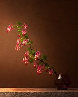 Deze siertrosbes, ribes sanguineum, kruipt naar het licht! Prachtige afbeelding in de sfeer van de “Dutch Masters” uit de Gouden Eeuw. Mooie warme koper, bruine tinten zorgen samen met de bloeiende roze, rode bloesem met fris groene blaadjes voor een sfeervol geheel. Deze wanddecoratie is tijdloos en zal jarenlang een eyecatcher blijven in uw interieur!