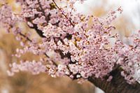 De roze Japanse sierkers staat in bloei bij zonsopgang op een lentemorgen in Kassel