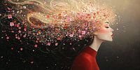 Een betoverend portret van een vrouw in profiel, haar haar transformeert in een explosie van kleurrijke bloemen en lichtpuntjes, symboliserend innerlijke schoonheid en de ontluiking van creativiteit en emoties.