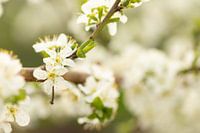 Twee scherpe bloempjes van de zoete pruim met op de achtergrond vaag een wolk van witte bloesem. De Aprimira is een combinatie van de Mirabelle en de Abrikoos. Het is een van de fruitsoorten van de steenvrucht en bloeit al vroeg (eind maart begin april).