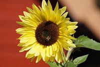 Hier heb ik de bloesem van een zonnebloem gefotografeerd als close-up in mijn tuin, met een bij bijna in het midden van de foto. Dit was de eerste keer dat het me lukte om zonnebloemen uit zaad te kweken en tot bloei te brengen. De grote bloem lijkt echt op een zon. Deze bloem is echt iets speciaals met zijn hoogte en zijn grote bloemen…