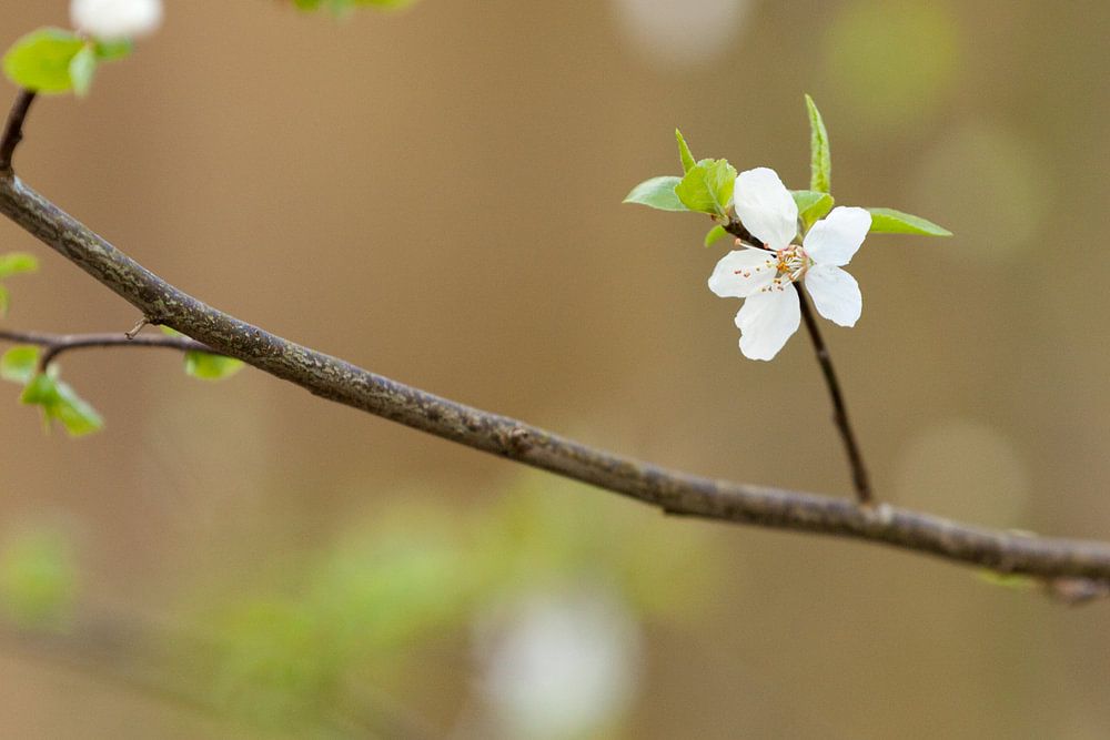 Een takje van de sleedoorn in het vroege voorjaar. Een enkel bloempje van de bloesem van sleedoorn is open.