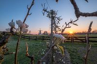 Een prachtige sfeervolle foto van molen De Vlinder tussen de fruitbomen en bloesem.