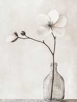 Bloesem - Dit bloemen schilderij toont een subtiele, enkele bloesem, geplaatst in een simpele glazen fles, waarbij de nadruk ligt op de tederheid van de bloem tegen een zacht getextureerde achtergrond.