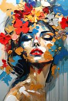 Het gezicht van de vrouw, geschilderd met een mix van krachtige en zachte penseelstreken, straalt een diepe rust uit met de ogen gesloten, alsof ze in een staat van diepe meditatie…