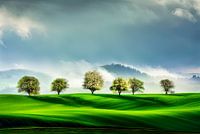 Foto "Bloesempracht in Luxemburg": Laat je betoveren door de prachtige bloesems van de bomen in het schilderachtige landschap van Luxemburg. Deze foto vangt het magische moment waarop de bomen in volle bloei staan en de lucht boven hen een bijna epische uitstraling heeft.