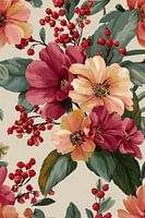 Een weelderig floraal patroon waarin zachte perzikkleurige en dieproze bloemen de hoofdrol spelen, perfect in balans gebracht door felrode bessentakken en diepgroene bladeren. De compositie straalt een tijdloze elegantie uit met een moderne twist, waarbij de zachte vintage uitstraling wordt versterkt door het roomwitte canvas waarop het…