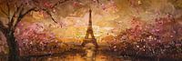 Dit werk toont de iconische Eiffeltoren omgeven door prachtige bloesems. De roze en paarse tinten van de bloemen contrasteren mooi met de warme gouden gloed van de zonsondergang. Het geheel straalt romantiek en elegantie uit, perfect voor liefhebbers van Parijs. Dit werk brengt een stukje Franse charme en schoonheid in je interieur, ideaal voor een sfeervolle en inspirerende omgeving.