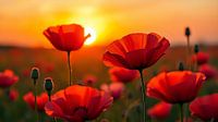 Op deze adembenemende foto staan heldere klaprozen in volle bloei terwijl de zon zachtjes ondergaat aan de horizon. De lucht is een fascinerend kleurenspel, met warme gouden en oranje tinten die naadloos overgaan in zacht roze en paars, alsof de natuur zelf met een penseel aan het werk is. De klaprozen, met hun delicate rode…