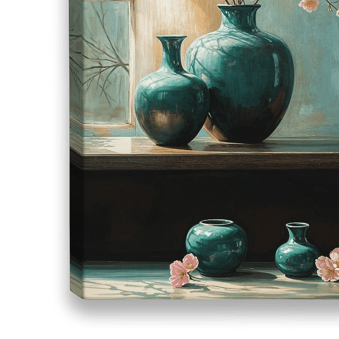 Dit kunstwerk nodigt de kijker uit om een moment van verstilde contemplatie te ervaren. De zachte, warme lichtinval door het venster contrasteert prachtig met de koele, turquoise tinten van de vazen en de achtergrond, wat een gevoel van balans en harmonie creëert. De delicate perzikkleurige bloesems lijken te dansen in het licht, hun…