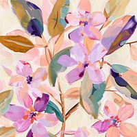 levendige en speelse energie uit door de kleurrijke en abstracte weergave van bloemen en bladeren. De compositie is gevuld met zachte roze en paarse tinten, aangevuld met aardse groene en bruine accenten. De losse penseelstreken en organische vormen geven de bloemen een dynamisch en vloeiend gevoel, alsof ze in beweging zijn onder een zachte lentebries. De gelaagdheid van de kleuren en overlappende elementen creëert een gevoel van diepte en textuur, wat het schilderij een rijke, visuele aantrekkingskracht geeft.